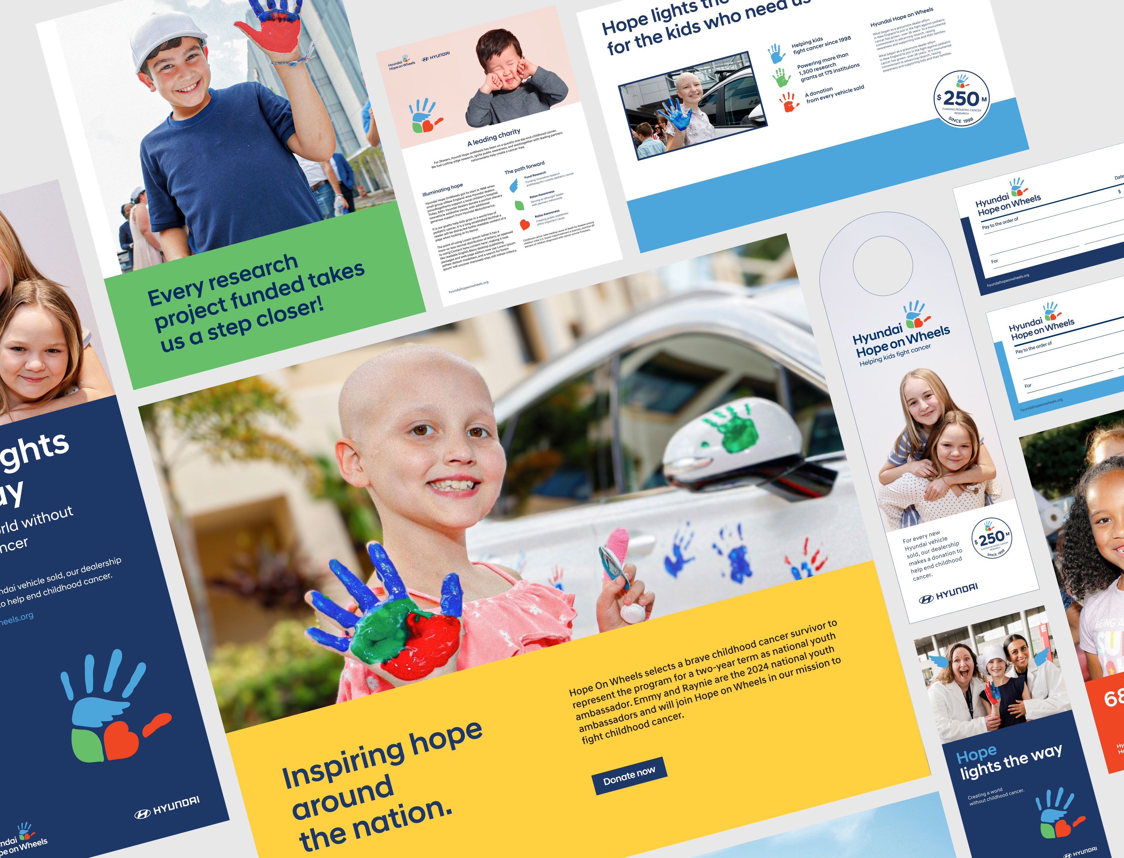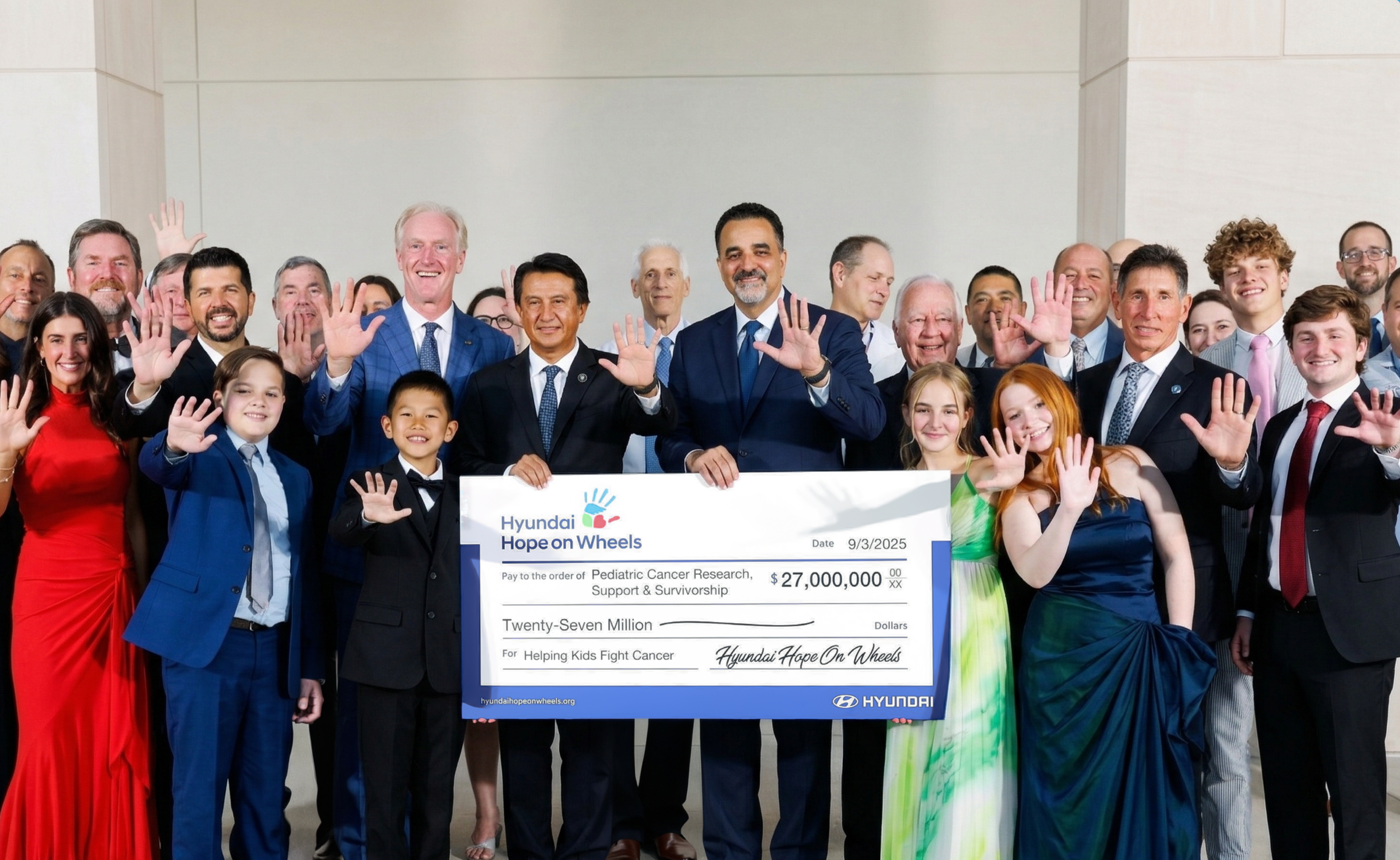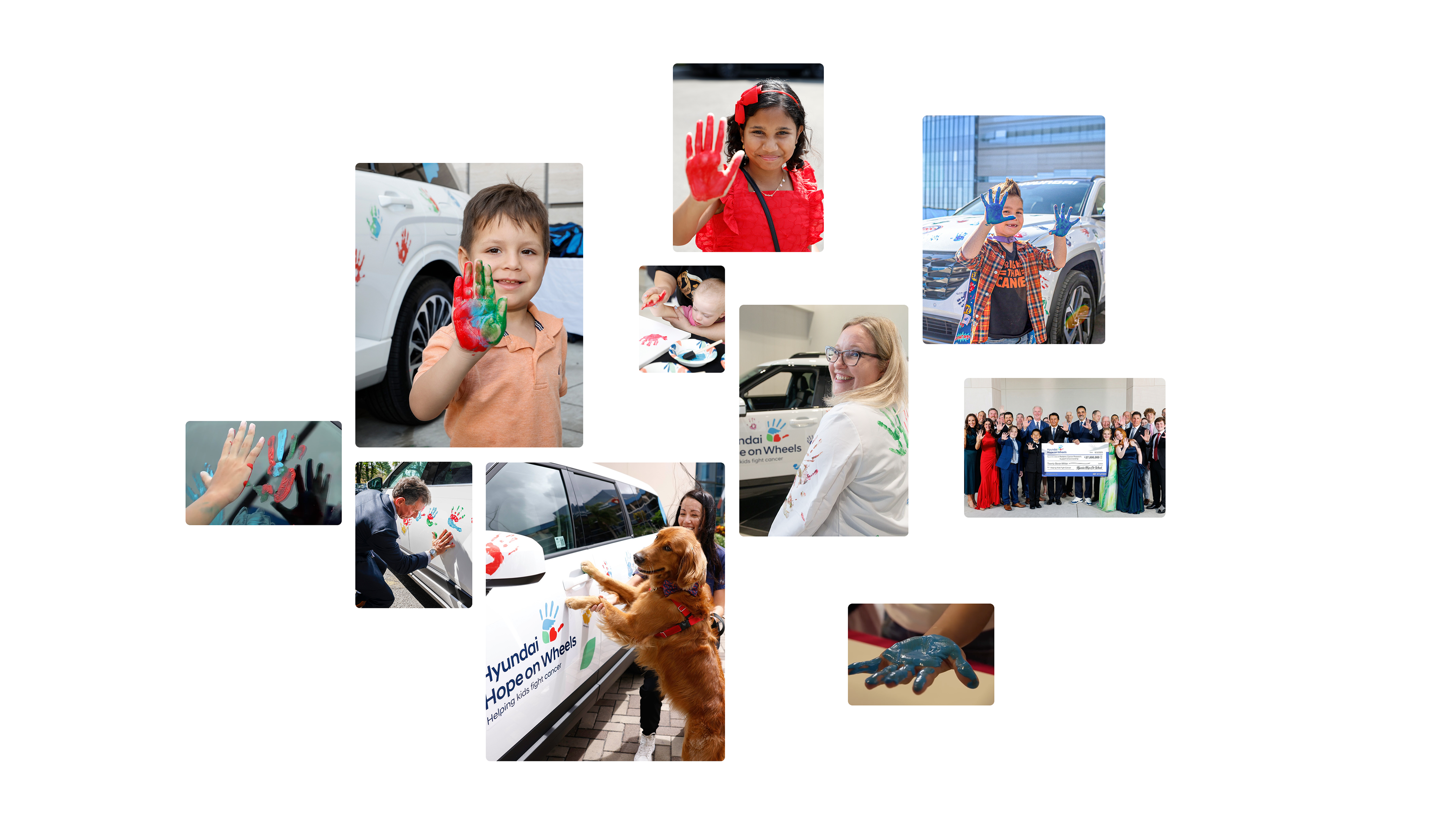 1998년부터 시작된 ‘현대 호프온휠스‘는 미국 전역의 현대자동차 딜러들이 참여하여 소아암 환아들을 돕는 현대자동차 미국법인의 대표적인 사회공헌(CSR) 사업입니다. 기부금 지원을 넘어 환아와 의사들이 차량에 직접 손바닥 자국을 남기는 ‘핸드 프린팅 세레머니’는 희망과 사랑, 그리고 회복의 메시지를 전하는 브랜드만의 시그니처로 자리 잡아 왔습니다.