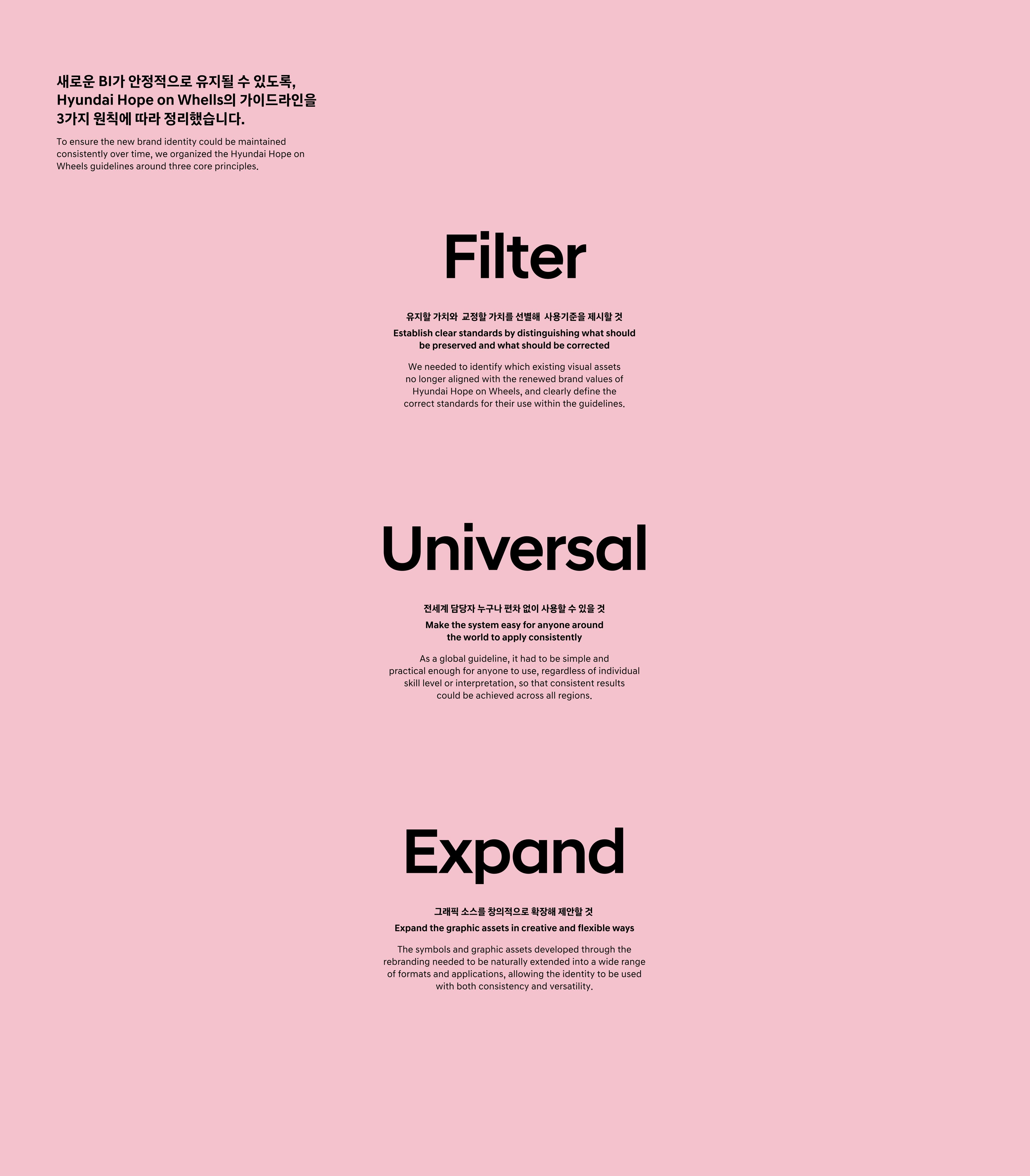 As a strategic partner in this brand renewal project,Case-Creative collaborated closely with Hyundai’s Brand Experience Team to translate the newly established BI concept into a sophisticated visual system and comprehensive design assets. A primary focus of the design process was building an intuitive visual language tailored for a global audience while ensuring operational efficiency. The core challenge was to establish a systematic design framework that would allow local agencies and production partners worldwide to maintain brand consistency without confusion. Working in tandem with Hyundai’s Brand Experience Team, CASE Creative developed unique design assets, visual motifs, and a dedicated color system. This collaboration extended to the creation of various on- and off-line application designs and the establishment of global guidelines, ensuring the brand’s mission is communicated effectively across all global touchpoints.