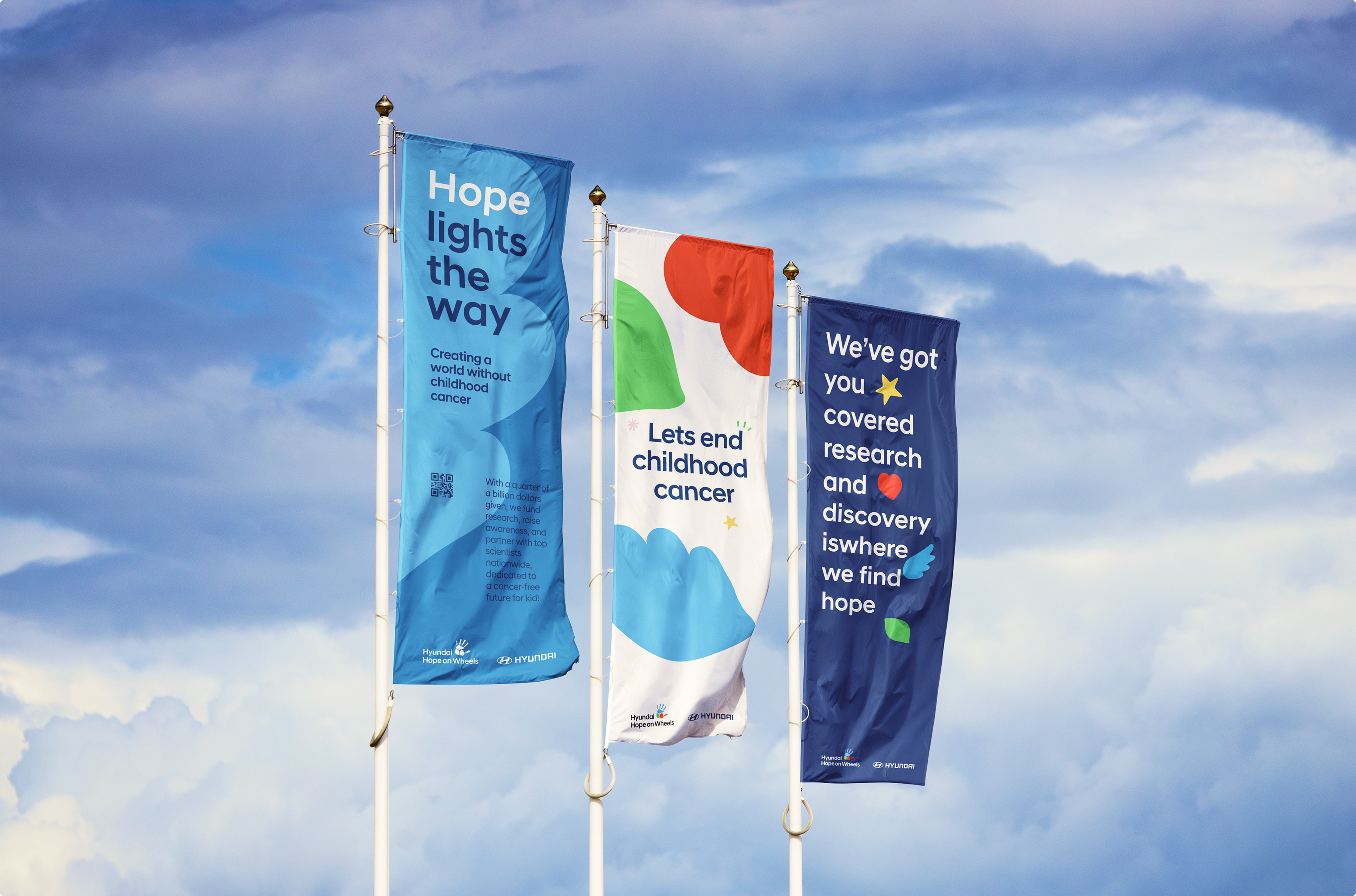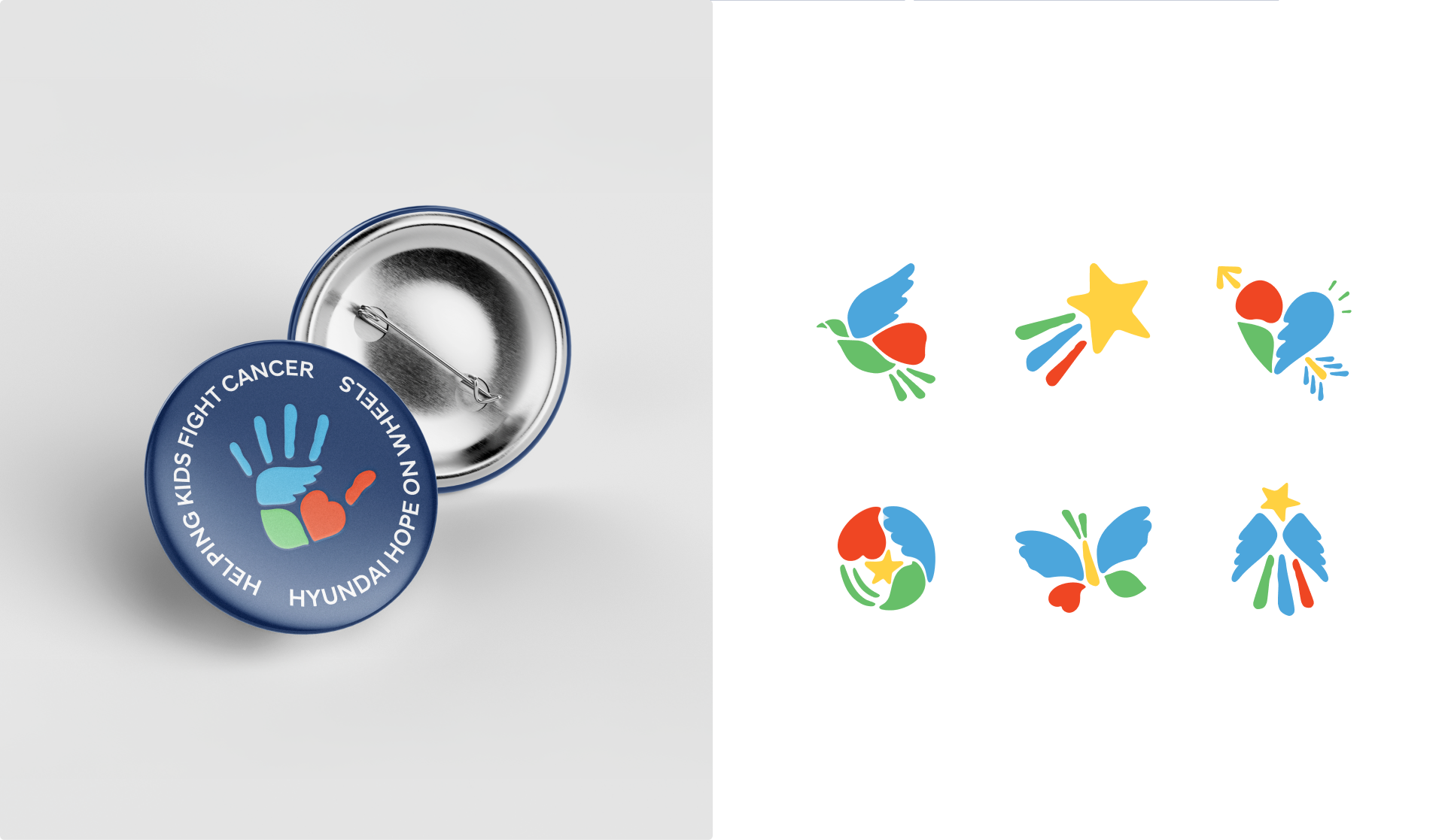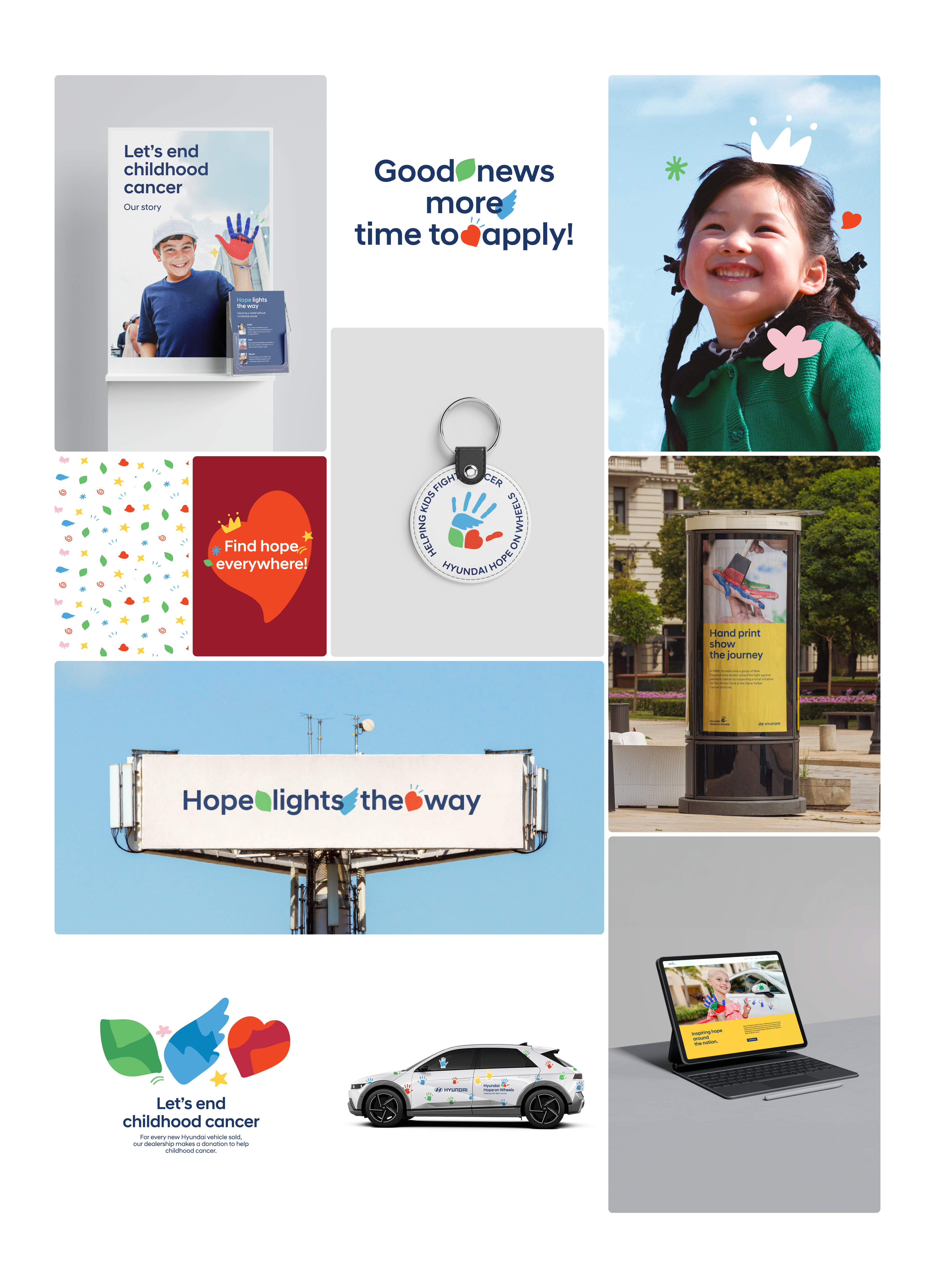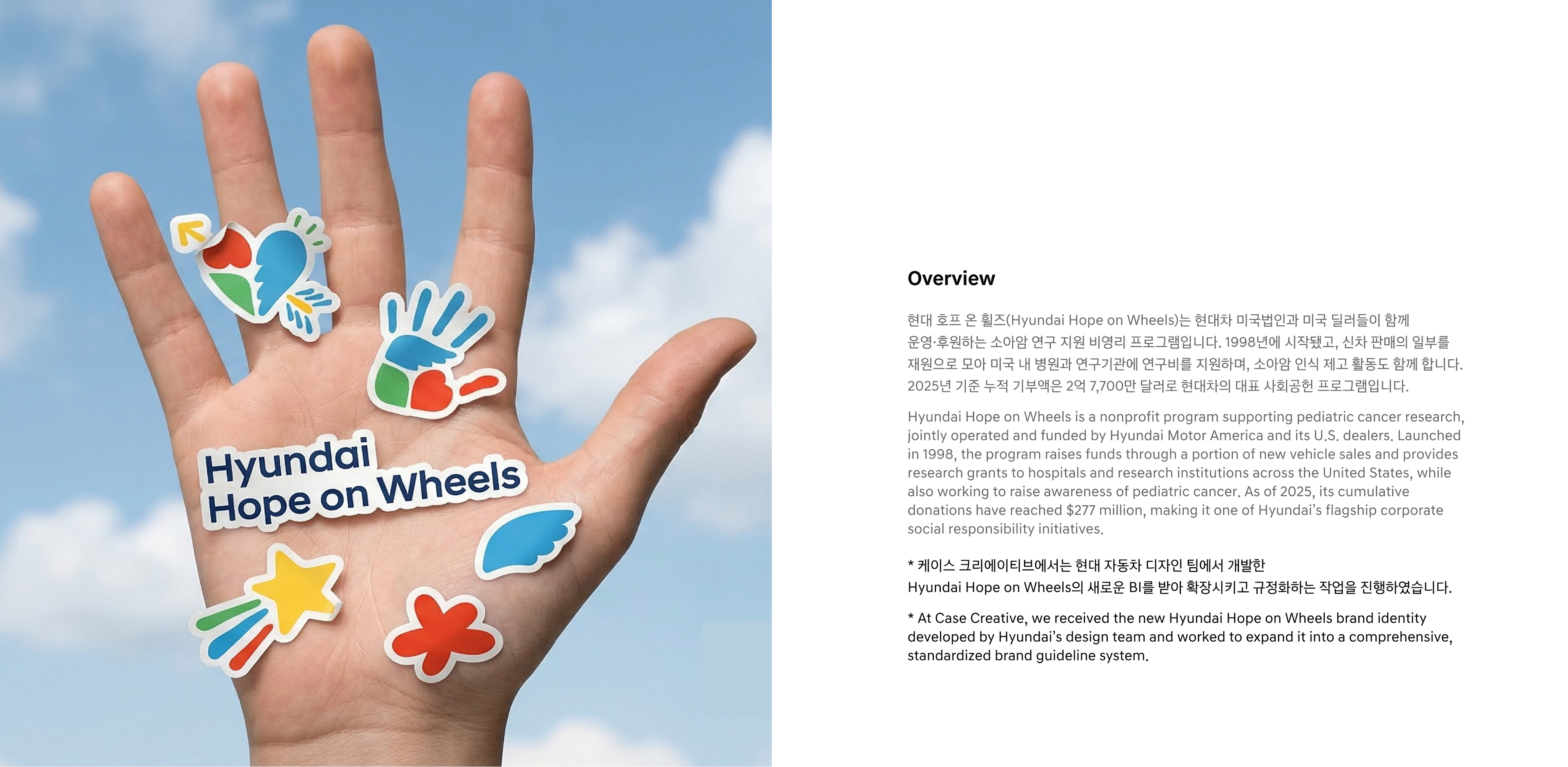 As Hyundai Motor Company’s Brand Experience Team prepared for the global expansion of Hope on Wheels, they developed a new BI and concept that strengthened the brand philosophy by integrating three key elements into the existing handprint symbol: wings (Hope), a heart (Love), and a leaf (Recovery).