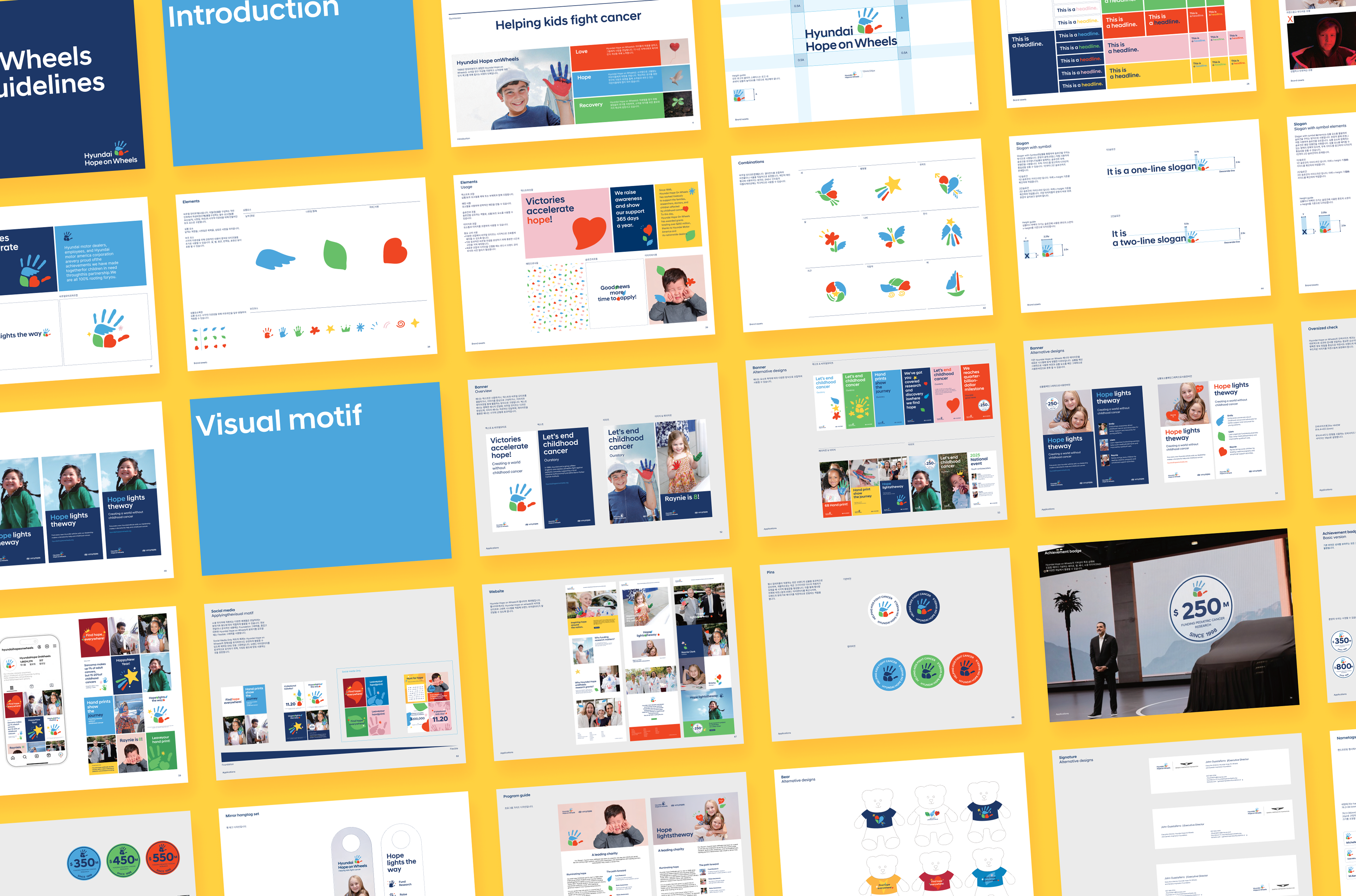 이를 위해 현대자동차 브랜드경험팀과 소통하며 호프온휠스만의 독창적인 디자인 에셋 개발부터 비주얼 모티프, 전용 컬러 시스템, 온·오프라인 어플리케이션 디자인 및 글로벌 가이드라인 수립을 진행하였으며, 브랜드의 의미가 전 세계에 효과적으로 전달될 수 있도록 함께 프로젝트를 마무리하였습니다.